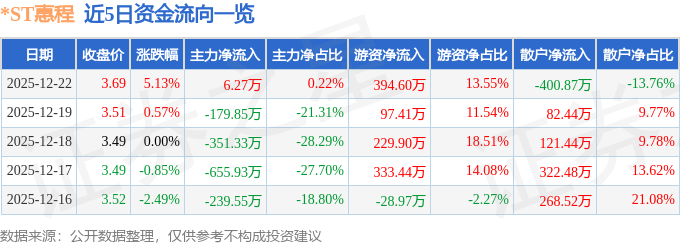 证券之星消息,截至2025年12月22日收盘,*ST惠程(002168)报收于3.69元,上涨5.13%,换手率1.02%,成交量8.01万手,成交额2913.04万元。