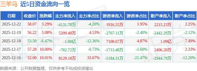 证券之星消息,截至2025年12月22日收盘,三羊马(001317)报收于58.07元,上涨3.29%,换手率48.75%,成交量17.07万手,成交额9.84亿元。
