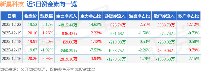 证券之星消息,截至2025年12月22日收盘,新晨科技(300542)报收于19.52元,下跌3.17%,换手率6.71%,成交量16.61万手,成交额3.29亿元。
