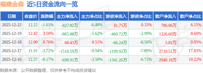 证券之星消息,截至2025年12月22日收盘,福建金森(002679)报收于12.22元,下跌1.61%,换手率4.43%,成交量10.44万手,成交额1.28亿元。