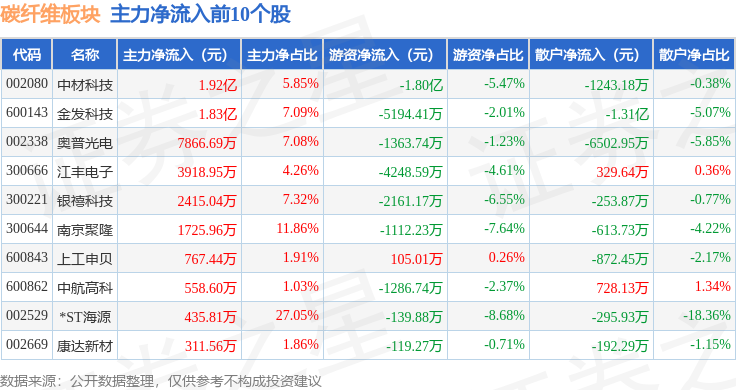 从资金流向上来看,当日碳纤维板块主力资金净流入2.87亿元,游资资金净流出4.54亿元,散户资金净流入1.67亿元。碳纤维板块个股资金流向见下表: