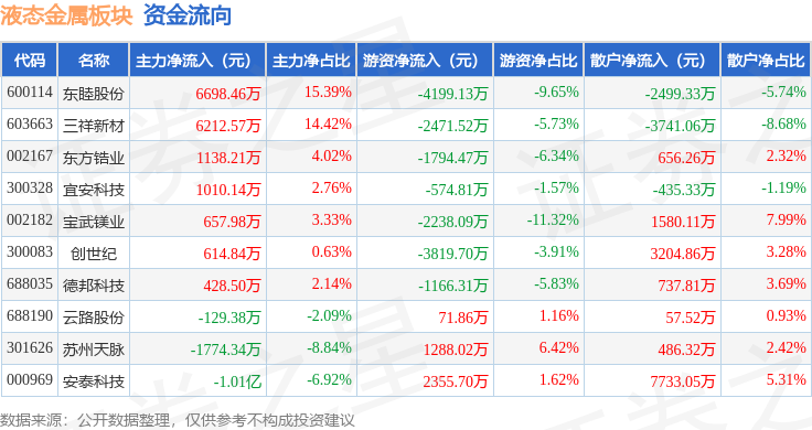 从资金流向上来看,当日液态金属板块主力资金净流入4768.24万元,游资资金净流出1.25亿元,散户资金净流入7780.21万元。液态金属板块个股资金流向见下表: