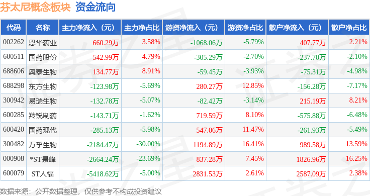 从资金流向上来看,当日芬太尼概念板块主力资金净流出9614.89万元,游资资金净流入4895.39万元,散户资金净流入4719.5万元。芬太尼概念板块个股资金流向见下表: