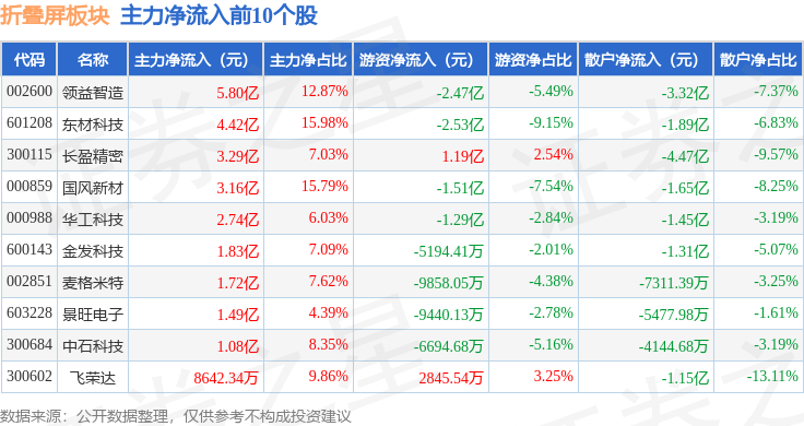 从资金流向上来看,当日折叠屏板块主力资金净流入15.95亿元,游资资金净流出7.84亿元,散户资金净流出8.11亿元。折叠屏板块个股资金流向见下表: