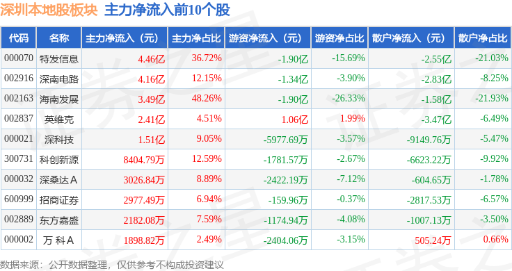 从资金流向上来看,当日深圳本地股板块主力资金净流入11.42亿元,游资资金净流出3.54亿元,散户资金净流出7.87亿元。深圳本地股板块个股资金流向见下表: