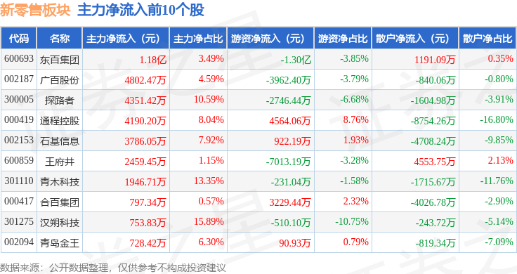 从资金流向上来看,当日新零售板块主力资金净流出25.25亿元,游资资金净流入1.88亿元,散户资金净流入23.37亿元。新零售板块个股资金流向见下表: