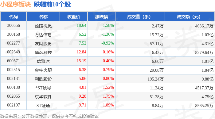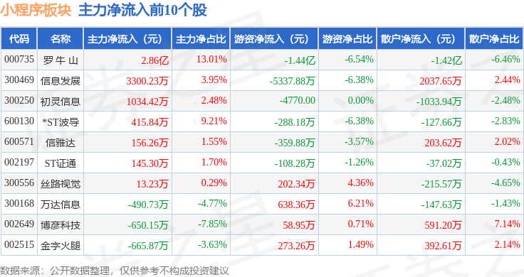 从资金流向上来看,当日小程序板块主力资金净流入2.44亿元,游资资金净流出1.81亿元,散户资金净流出6309.48万元。小程序板块个股资金流向见下表: