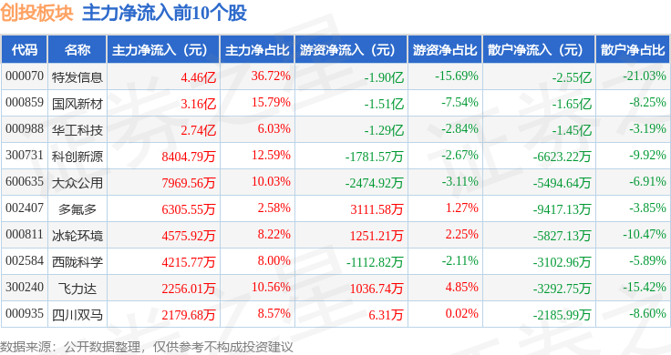 从资金流向上来看,当日创投板块主力资金净流出8.13亿元,游资资金净流入2.99亿元,散户资金净流入5.14亿元。创投板块个股资金流向见下表: