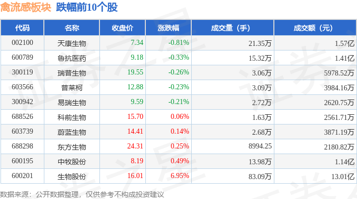 从资金流向上来看,当日禽流感板块主力资金净流出1.8亿元,游资资金净流入6837.96万元,散户资金净流入1.11亿元。禽流感板块个股资金流向见下表: