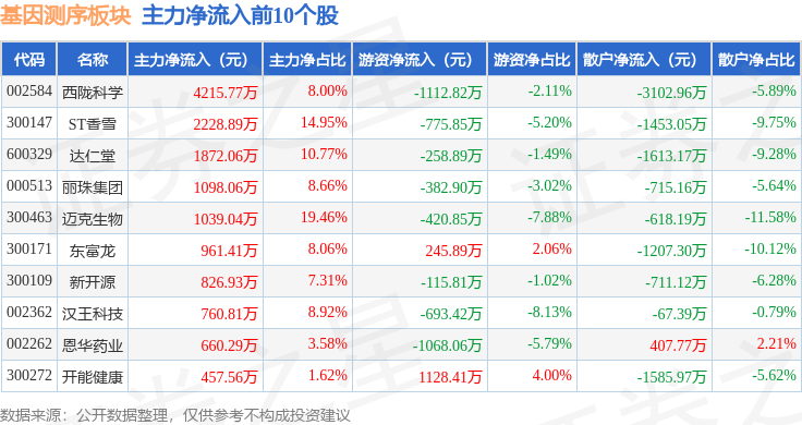 从资金流向上来看,当日基因测序板块主力资金净流出4.54亿元,游资资金净流入1.46亿元,散户资金净流入3.08亿元。基因测序板块个股资金流向见下表: