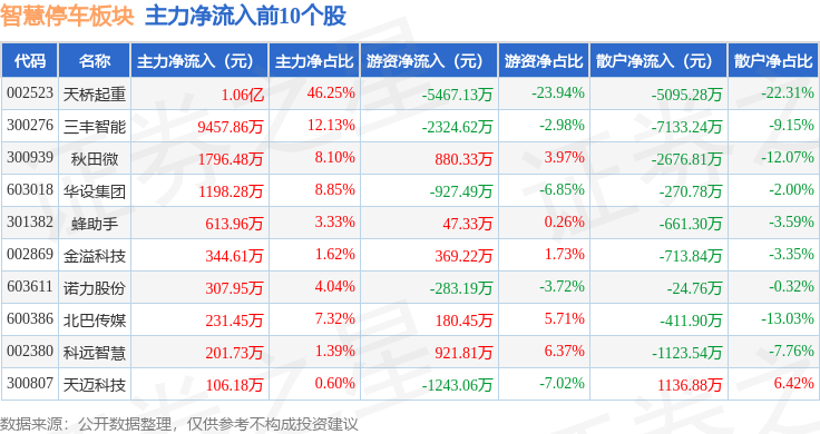 从资金流向上来看,当日智慧停车板块主力资金净流出7.16亿元,游资资金净流入1.0亿元,散户资金净流入6.16亿元。智慧停车板块个股资金流向见下表: