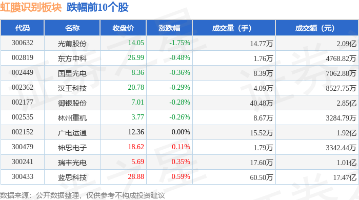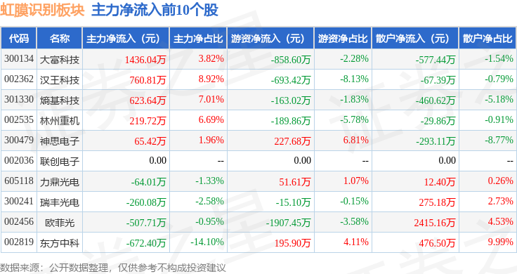 从资金流向上来看,当日虹膜识别板块主力资金净流出2.58亿元,游资资金净流入9361.5万元,散户资金净流入1.64亿元。虹膜识别板块个股资金流向见下表: