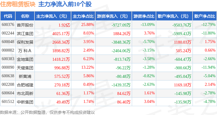 从资金流向上来看,当日住房租赁板块主力资金净流入568.25万元,游资资金净流入475.88万元,散户资金净流出1044.13万元。住房租赁板块个股资金流向见下表: