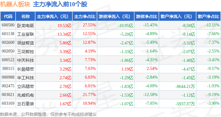 从资金流向上来看,当日机器人板块主力资金净流入51.34亿元,游资资金净流出28.59亿元,散户资金净流出22.75亿元。机器人板块个股资金流向见下表: