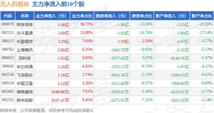 从资金流向上来看,当日无人机板块主力资金净流出7.41亿元,游资资金净流出6.64亿元,散户资金净流入14.05亿元。无人机板块个股资金流向见下表: