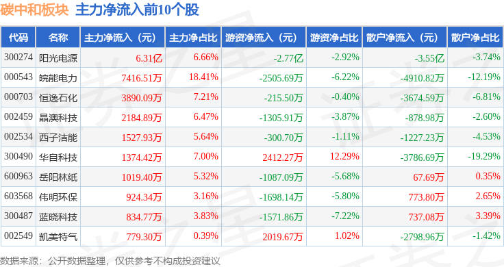 从资金流向上来看,当日碳中和板块主力资金净流出14.58亿元,游资资金净流入1.4亿元,散户资金净流入13.18亿元。碳中和板块个股资金流向见下表: