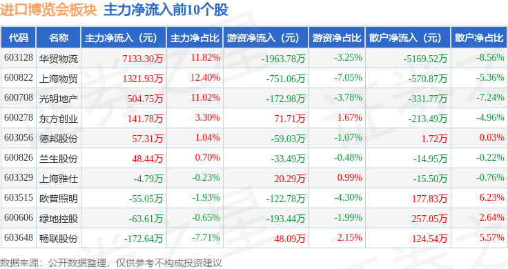 从资金流向上来看,当日进口博览会板块主力资金净流入6478.9万元,游资资金净流出1318.8万元,散户资金净流出5160.1万元。进口博览会板块个股资金流向见下表: