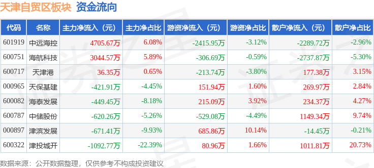从资金流向上来看,当日天津自贸区板块主力资金净流入4530.78万元,游资资金净流出2331.61万元,散户资金净流出2199.17万元。天津自贸区板块个股资金流向见下表: