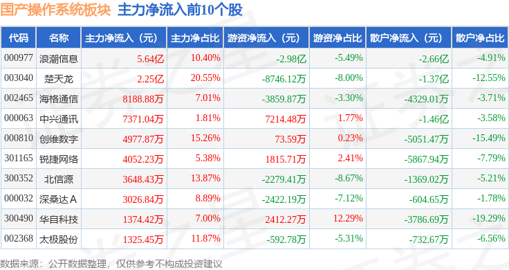 从资金流向上来看,当日国产操作系统板块主力资金净流入6.11亿元,游资资金净流出3.42亿元,散户资金净流出2.69亿元。国产操作系统板块个股资金流向见下表: