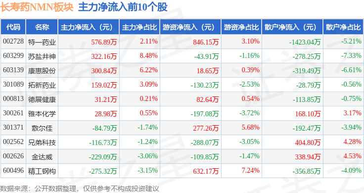 从资金流向上来看,当日长寿药NMN板块主力资金净流出2.28亿元,游资资金净流入4093.37万元,散户资金净流入1.87亿元。长寿药NMN板块个股资金流向见下表: