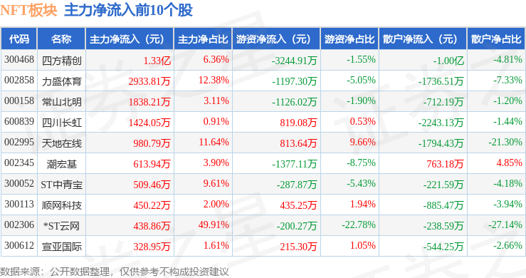 从资金流向上来看,当日NFT板块主力资金净流出11.76亿元,游资资金净流入2.76亿元,散户资金净流入8.99亿元。NFT板块个股资金流向见下表: