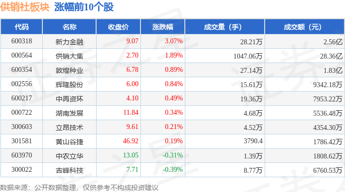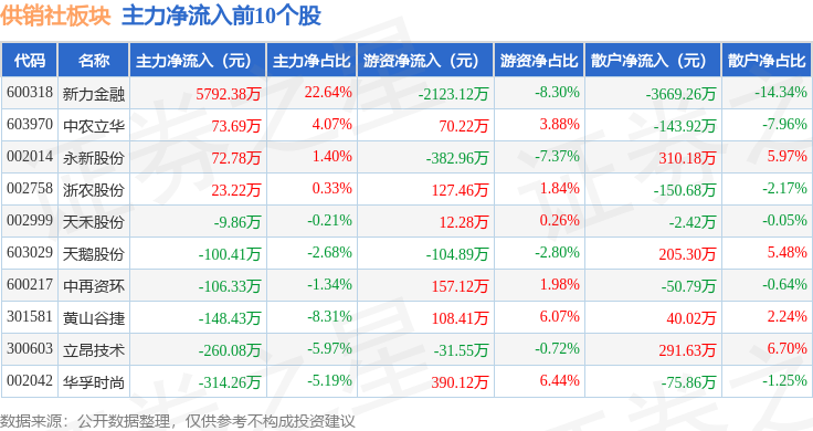 从资金流向上来看,当日供销社板块主力资金净流出9826.6万元,游资资金净流入3265.9万元,散户资金净流入6560.7万元。供销社板块个股资金流向见下表: