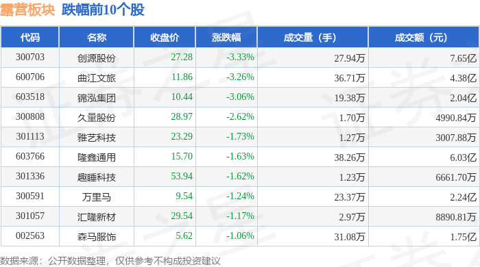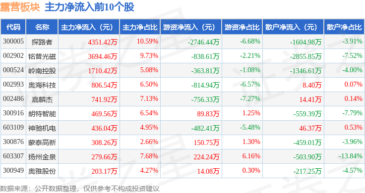 从资金流向上来看,当日露营板块主力资金净流出1.03亿元,游资资金净流出1.54亿元,散户资金净流入2.58亿元。露营板块个股资金流向见下表: