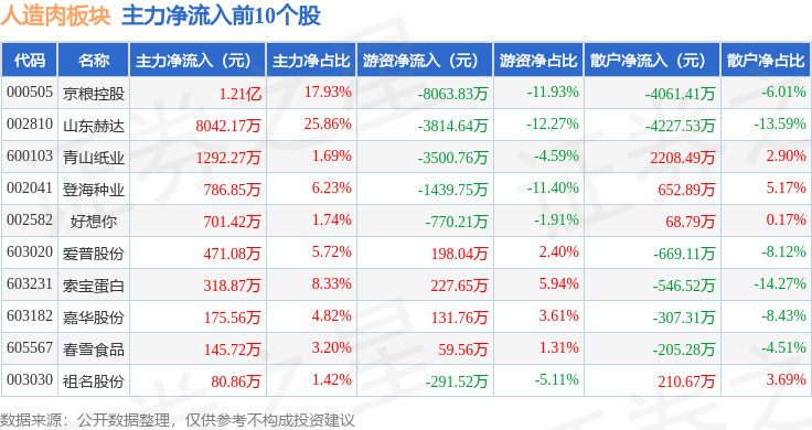 从资金流向上来看,当日人造肉板块主力资金净流出6222.34万元,游资资金净流出1.49亿元,散户资金净流入2.12亿元。人造肉板块个股资金流向见下表: