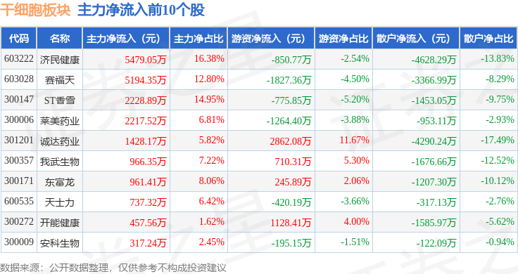 从资金流向上来看,当日干细胞板块主力资金净流出8892.07万元,游资资金净流入1.17亿元,散户资金净流出2818.64万元。干细胞板块个股资金流向见下表: