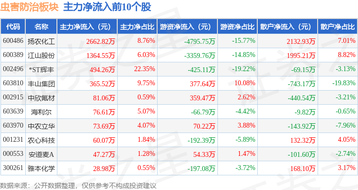 从资金流向上来看,当日虫害防治板块主力资金净流出7419.69万元,游资资金净流出4670.55万元,散户资金净流入1.21亿元。虫害防治板块个股资金流向见下表: