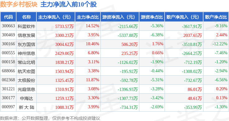 从资金流向上来看,当日数字乡村板块主力资金净流出6.08亿元,游资资金净流入4526.62万元,散户资金净流入5.63亿元。数字乡村板块个股资金流向见下表: