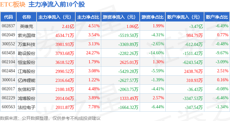 从资金流向上来看,当日ETC板块主力资金净流入1.74亿元,游资资金净流出1.9亿元,散户资金净流入1611.73万元。ETC板块个股资金流向见下表: