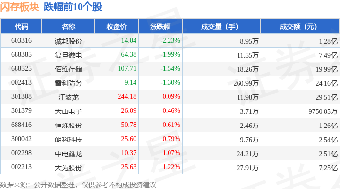 从资金流向上来看,当日闪存板块主力资金净流入5.23亿元,游资资金净流出7.06亿元,散户资金净流入1.83亿元。闪存板块个股资金流向见下表: