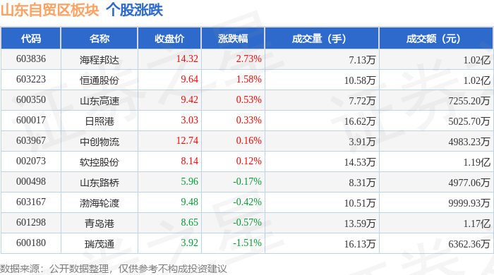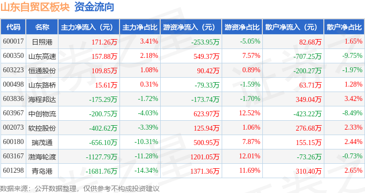 从资金流向上来看,当日山东自贸区板块主力资金净流出3789.71万元,游资资金净流入3956.05万元,散户资金净流出166.34万元。山东自贸区板块个股资金流向见下表: