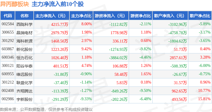从资金流向上来看,当日异丙醇板块主力资金净流入5451.61万元,游资资金净流出3766.55万元,散户资金净流出1685.06万元。异丙醇板块个股资金流向见下表:
