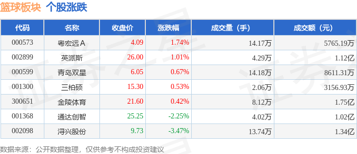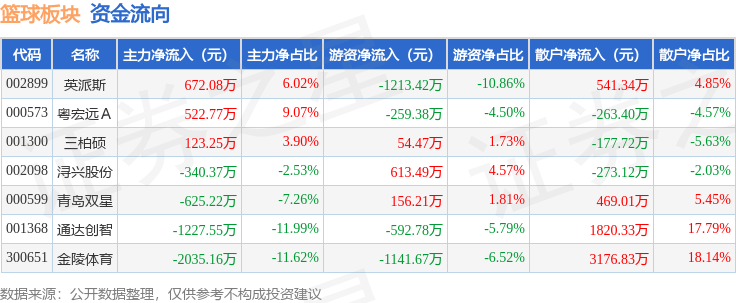 从资金流向上来看,当日篮球板块主力资金净流出2910.2万元,游资资金净流出2383.07万元,散户资金净流入5293.27万元。篮球板块个股资金流向见下表: