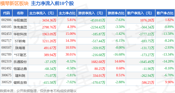从资金流向上来看,当日横琴新区板块主力资金净流出1.28亿元,游资资金净流出5496.23万元,散户资金净流入1.83亿元。横琴新区板块个股资金流向见下表: