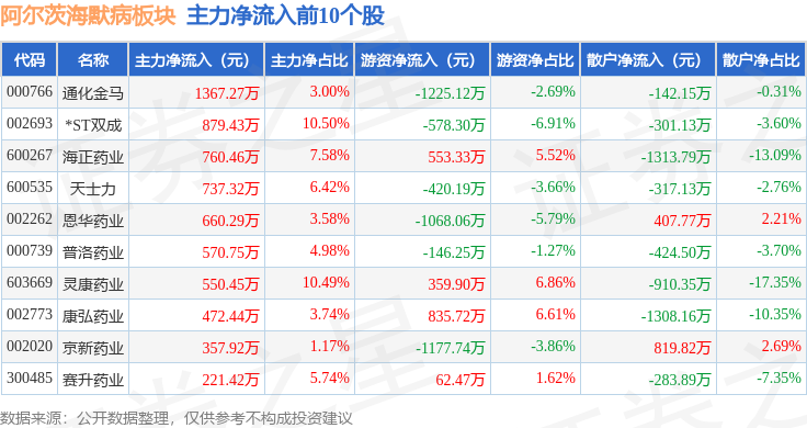 从资金流向上来看,当日阿尔茨海默病板块主力资金净流出5.63亿元,游资资金净流入2.21亿元,散户资金净流入3.43亿元。阿尔茨海默病板块个股资金流向见下表: