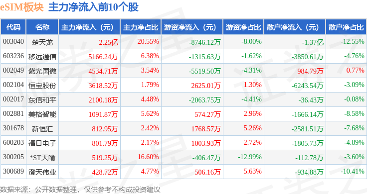 从资金流向上来看,当日eSIM板块主力资金净流入2.92亿元,游资资金净流出1.3亿元,散户资金净流出1.62亿元。eSIM板块个股资金流向见下表: