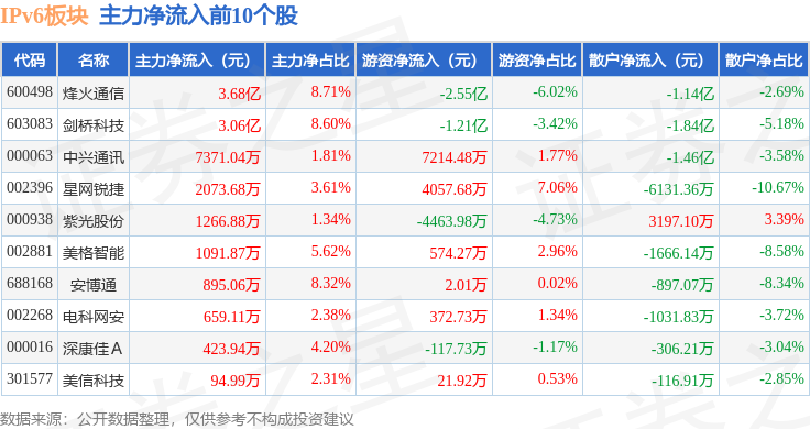 从资金流向上来看,当日IPv6板块主力资金净流入3.24亿元,游资资金净流出1.96亿元,散户资金净流出1.28亿元。IPv6板块个股资金流向见下表: