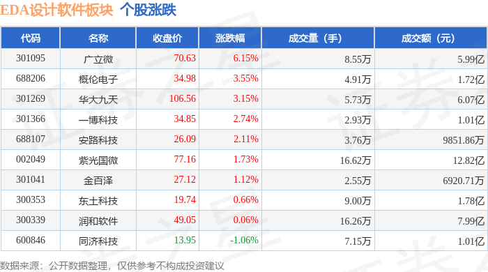 证券之星消息,12月22日EDA设计软件板块较上一交易日上涨2.02%,广立微领涨。当日上证指数报收于3917.36,上涨0.69%。深证成指报收于13332.73,上涨1.47%。EDA设计软件板块个股涨跌见下表: