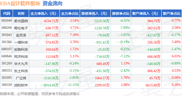 从资金流向上来看,当日EDA设计软件板块主力资金净流出4220.51万元,游资资金净流出4864.19万元,散户资金净流入9084.7万元。EDA设计软件板块个股资金流向见下表:
