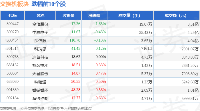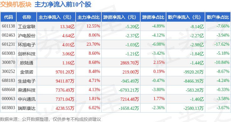 从资金流向上来看,当日交换机板块主力资金净流入30.45亿元,游资资金净流出10.42亿元,散户资金净流出20.03亿元。交换机板块个股资金流向见下表: