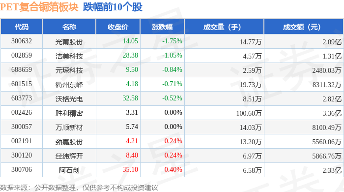 证券之星消息,12月22日PET复合铜箔板块较上一交易日上涨3.19%,亨通股份领涨。当日上证指数报收于3917.36,上涨0.69%。深证成指报收于13332.73,上涨1.47%。PET复合铜箔板块个股涨跌见下表:
