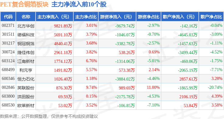 从资金流向上来看,当日PET复合铜箔板块主力资金净流出5738.87万元,游资资金净流出2.03亿元,散户资金净流入2.6亿元。PET复合铜箔板块个股资金流向见下表: