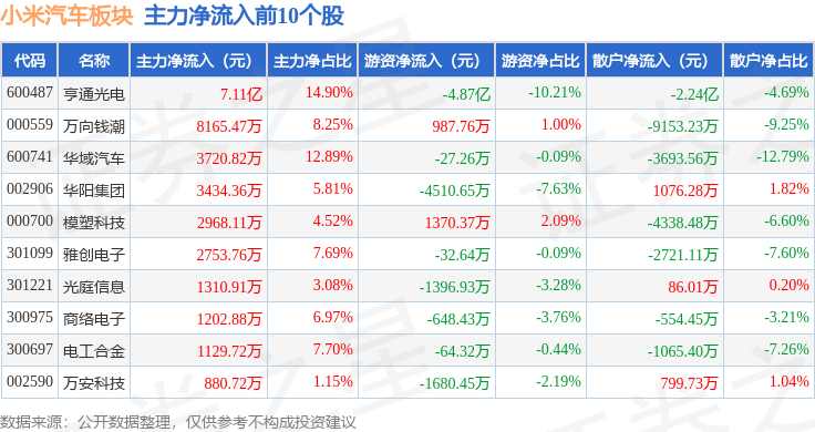 从资金流向上来看,当日小米汽车板块主力资金净流出6.9亿元,游资资金净流出4758.27万元,散户资金净流入7.37亿元。小米汽车板块个股资金流向见下表: