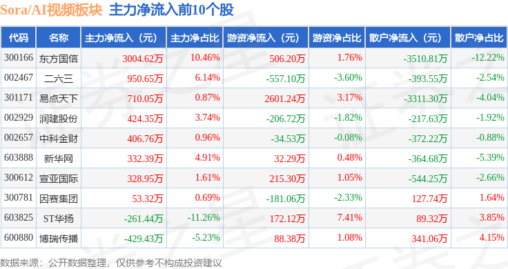 从资金流向上来看,当日Sora/AI视频板块主力资金净流出4.25亿元,游资资金净流入2.53亿元,散户资金净流入1.73亿元。Sora/AI视频板块个股资金流向见下表: