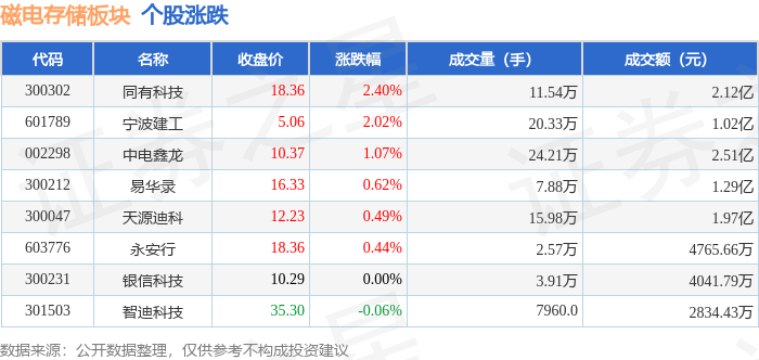 证券之星消息,12月22日磁电存储板块较上一交易日上涨0.98%,同有科技领涨。当日上证指数报收于3917.36,上涨0.69%。深证成指报收于13332.73,上涨1.47%。磁电存储板块个股涨跌见下表: