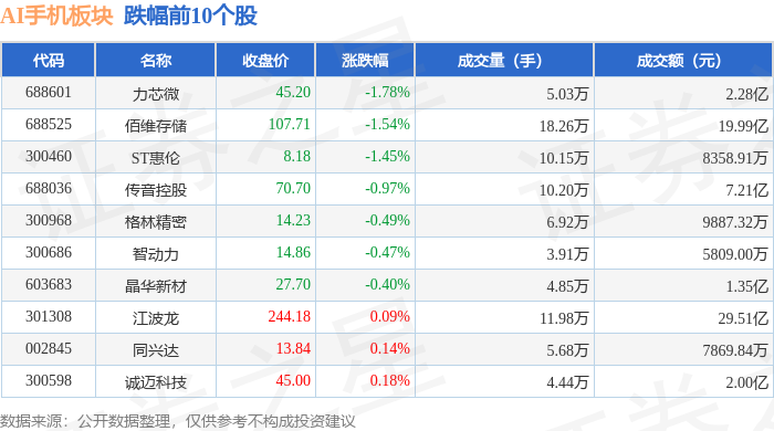 证券之星消息,12月22日AI手机板块较上一交易日上涨1.39%,希荻微领涨。当日上证指数报收于3917.36,上涨0.69%。深证成指报收于13332.73,上涨1.47%。AI手机板块个股涨跌见下表: