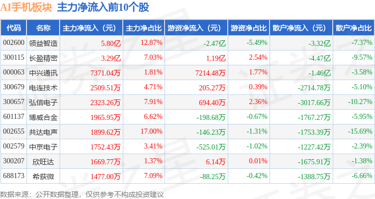 从资金流向上来看,当日AI手机板块主力资金净流入1.13亿元,游资资金净流入3.72亿元,散户资金净流出4.85亿元。AI手机板块个股资金流向见下表: